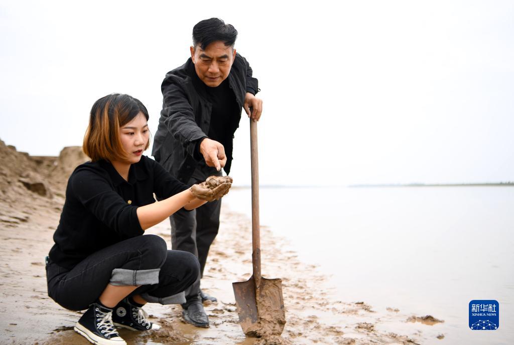 10月7日,在黄河河南洛阳段,游晓晓(左)捧起黄河泥,观察泥土细腻度。