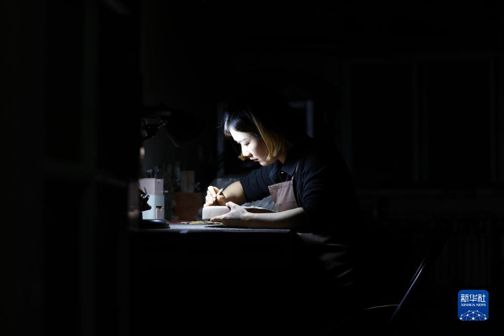 10月7日,游晓晓在工作室内雕刻砚坯。