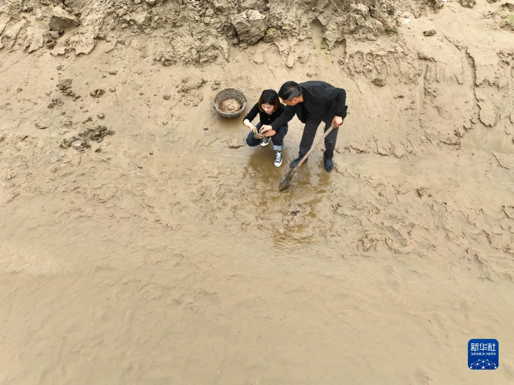 10月7日,在黄河河南洛阳段,游晓晓与父亲在采泥(无人机照片)。