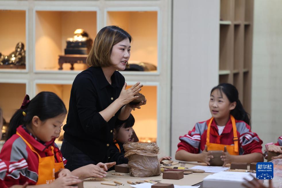 10月7日,在河南省洛阳市新安县河洛澄泥砚艺术馆,游晓晓在教小学生制作澄泥砚。