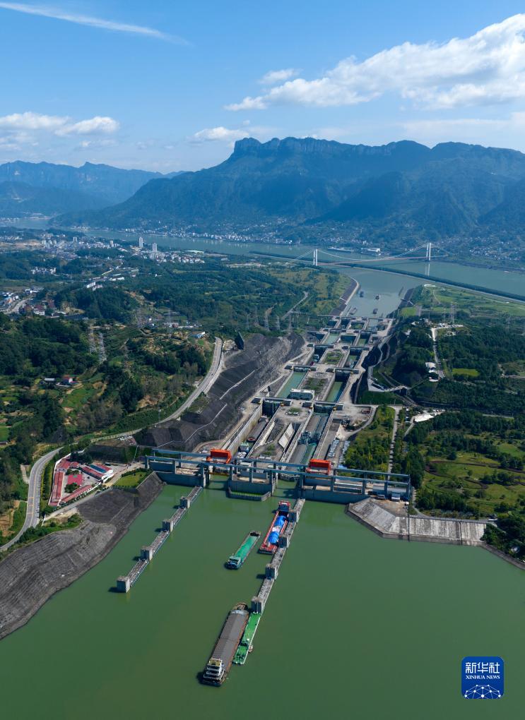 10月8日,在湖北省宜昌市,船舶有序通过三峡双线五级船闸(无人机照片)。