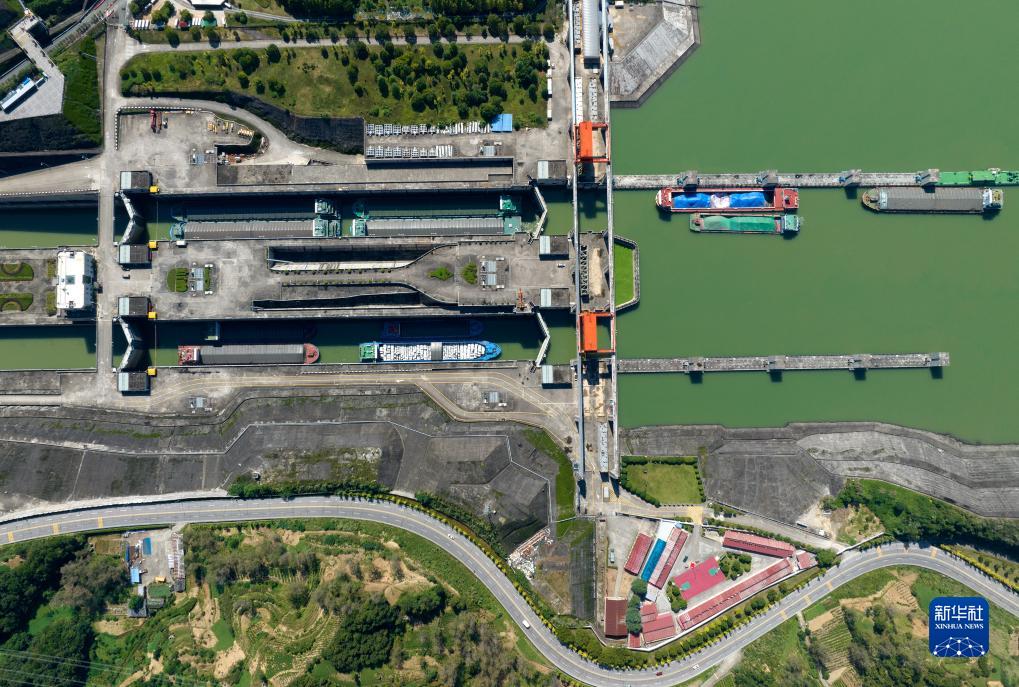 10月8日,在湖北省宜昌市,船舶有序通过三峡双线五级船闸(无人机照片)。
