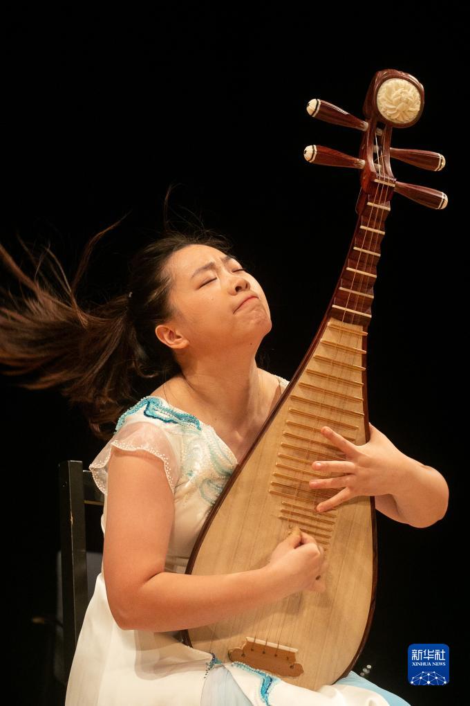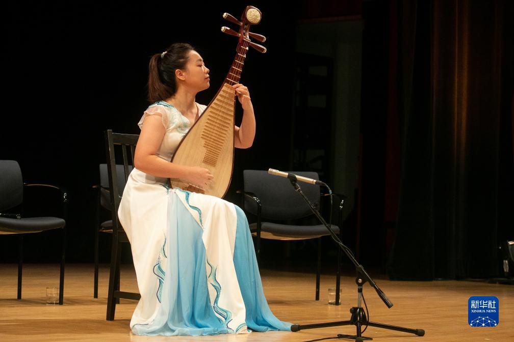 10月7日,中央音乐学院民乐系讲师、青年琵琶演奏家刘小菁在美国纽约举行的美中音乐论坛上演奏琵琶。新华社发(郭克摄)