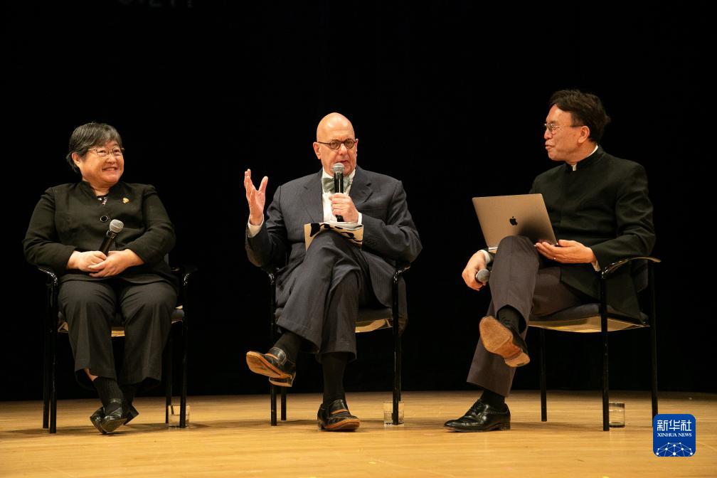 10月7日,美国巴德学院院长莱昂·博特斯坦(中)与华人作曲家、密苏里-堪萨斯城大学音乐与舞蹈学院教授陈怡(左)出席在纽约举行的美中音乐论坛。新华社发(郭克摄)