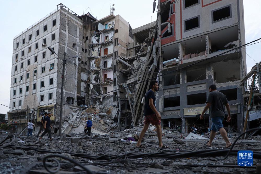 10月8日,巴勒斯坦人在加沙城查看以色列空袭后的建筑废墟。新华社发(里泽克·阿卜杜勒贾瓦德摄)