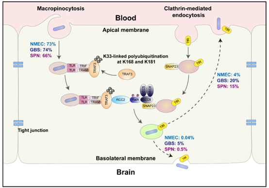 南开大学研究团队针对这一关键问题,经过多年攻关,发现主要脑膜炎病原细菌——肺炎链球菌、新生儿脑膜炎大肠杆菌通过劫持铁转运蛋白受体的胞内运输,穿越血脑屏障。研究结果提示,主要脑膜炎病原细菌利用共同机制穿越血脑屏障,因此这一机制的发现为开发防治细菌性脑膜炎的广谱药物提供了理论基础和潜在靶点,同时也为递送药物穿越血脑屏障提供了新思路。