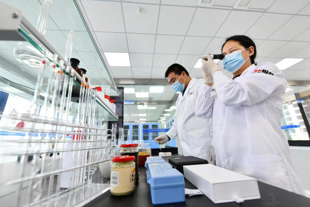 麻辣食品工业数字化研究院中,工作人员正在进行新产品配制试验。(杨圣龙 摄)