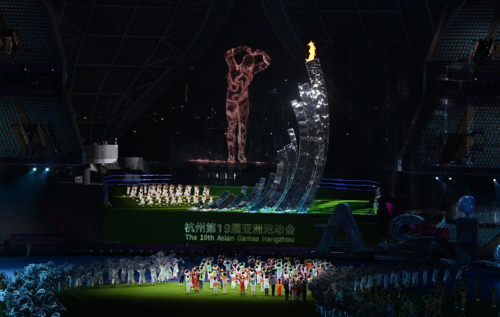 10月8日,数字火炬人“弄潮儿”准备熄灭主火炬。当日,杭州第19届亚洲运动会闭幕式在杭州奥体中心体育场举行。(新华社记者贾浩成摄)