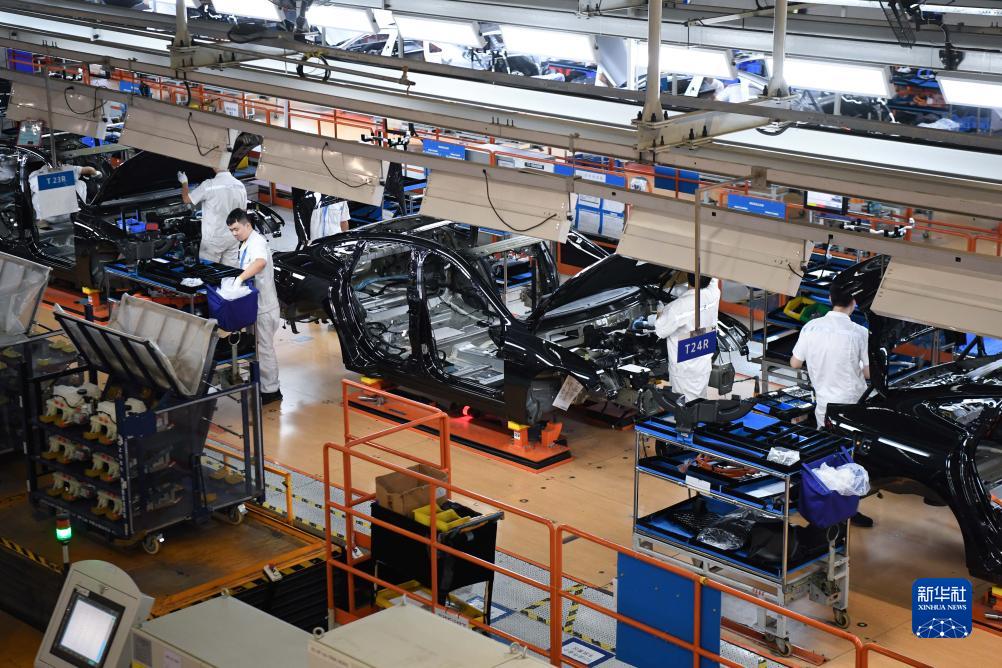 10月9日,工作人员在广东肇庆小鹏汽车智能网联科技产业园内的总装生产线上工作。