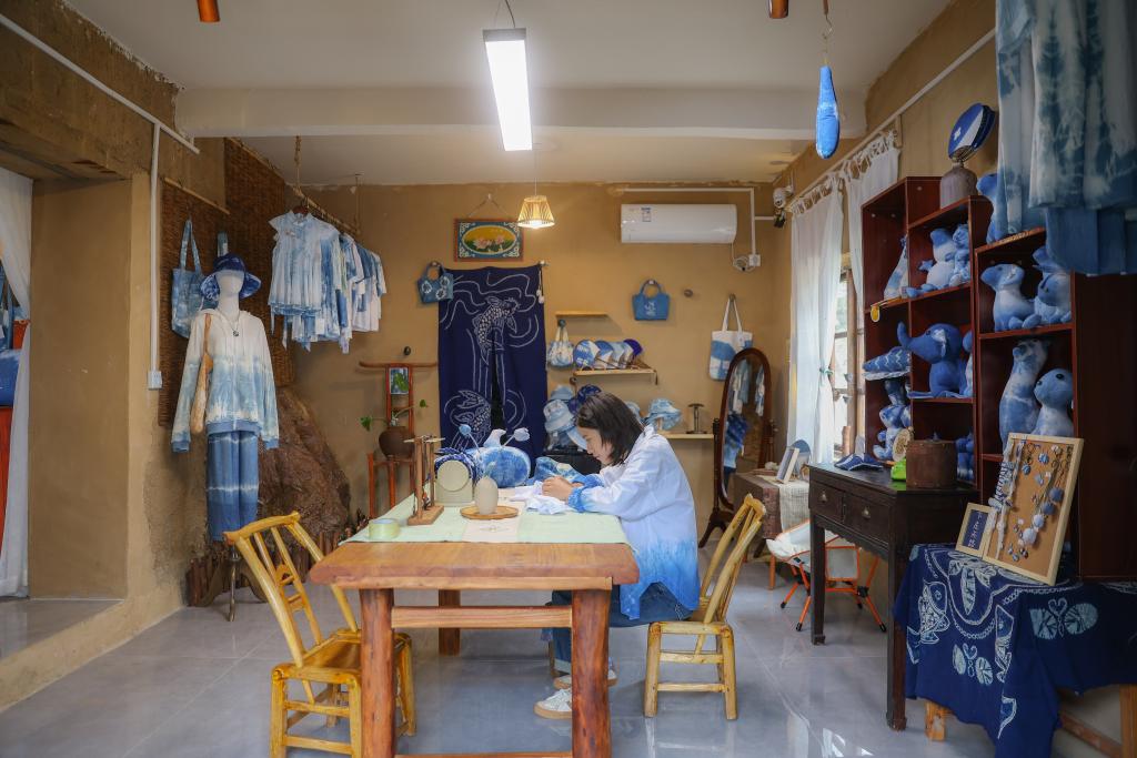 10月10日,在重庆市巫山县竹贤乡下庄村,返乡创业大学生袁孝鑫在下庄布谷扎染工坊内创作。新华社记者黄伟 摄