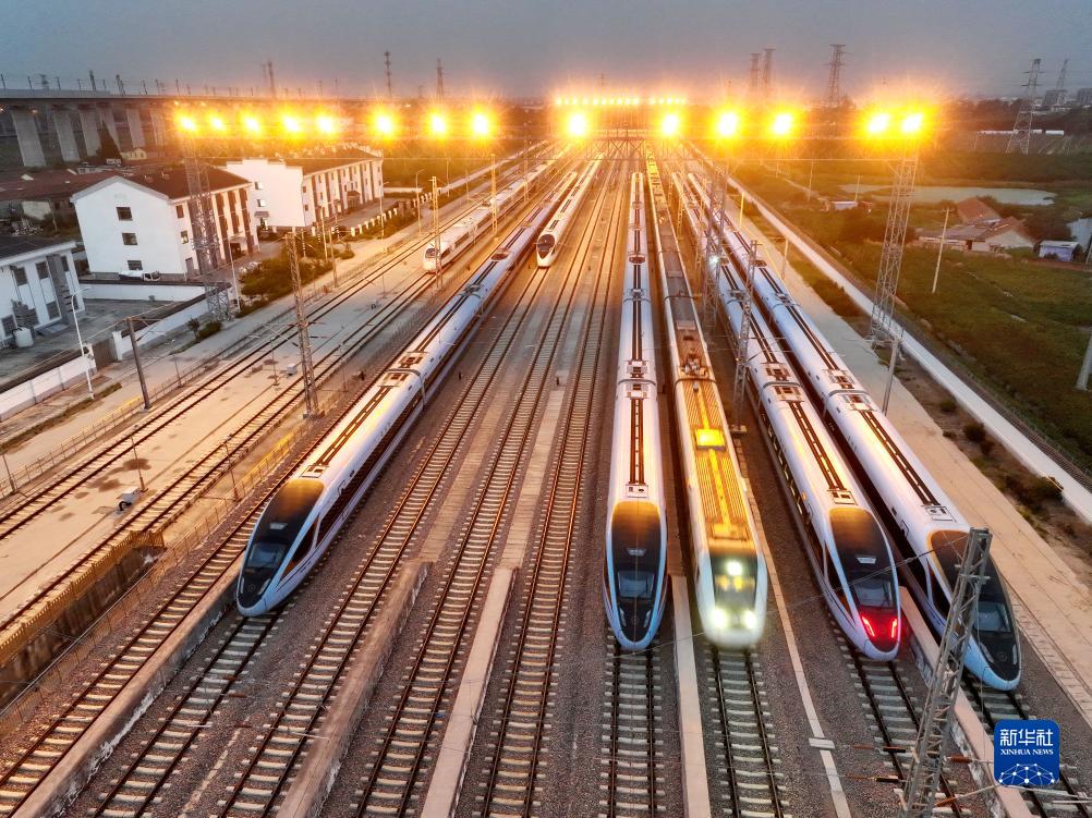 10月10日,动车组列车停在江苏省连云港市境内存车场等待发车(无人机照片)。新华社发(王春 摄)