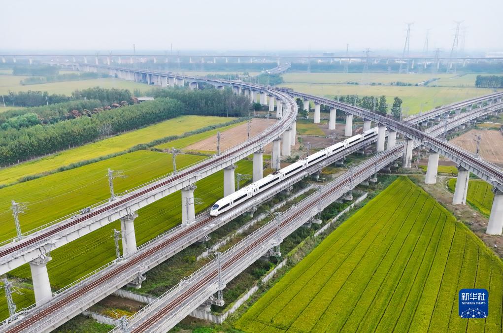 10月10日,一列动车组列车行驶在江苏连云港市(无人机照片)。新华社发(王健民 摄)