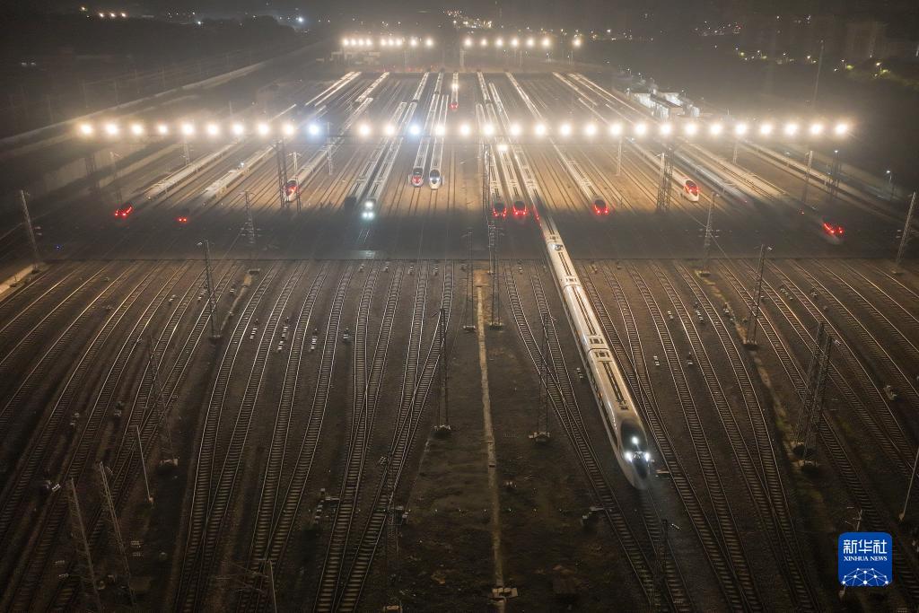 10月10日,动车组列车从南京动车段南京南动车运用所驶出(无人机照片)。新华社发(方东旭 摄)