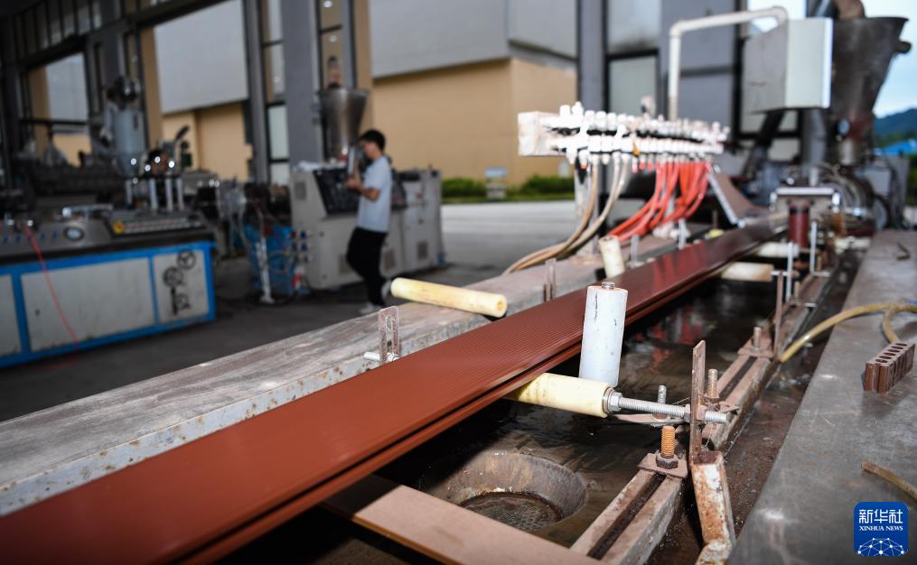 在广东广宁县一家公司车间拍摄的竹纤维板材挤压生产线(10月9日摄)。