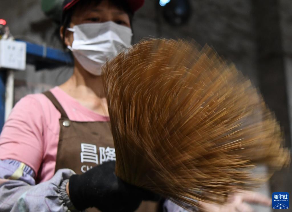 10月9日,在广东广宁县一家竹制品厂,工作人员筛选竹子制成的香芯。