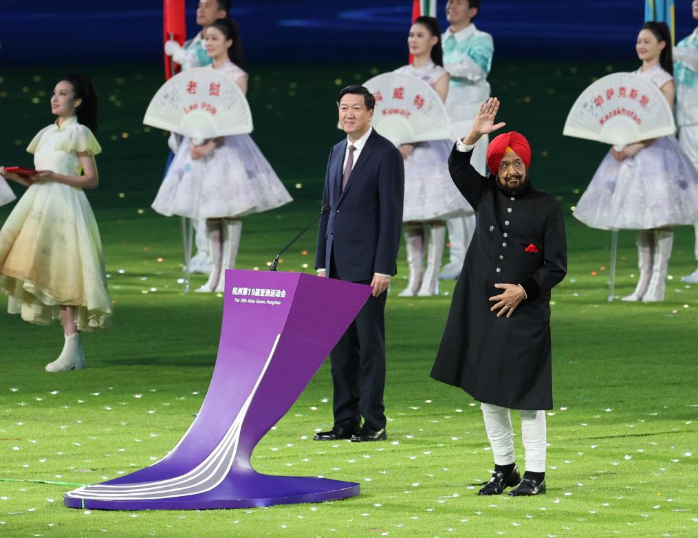 10月8日,亚奥理事会代理主席辛格在闭幕式上向观众致意。新华社记者 单宇琦 摄