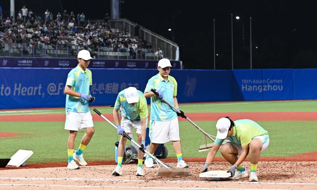 9月28日,志愿者在杭州亚运会棒球第一阶段第3场比赛间隙平整场地。新华社记者 杨冠宇 摄