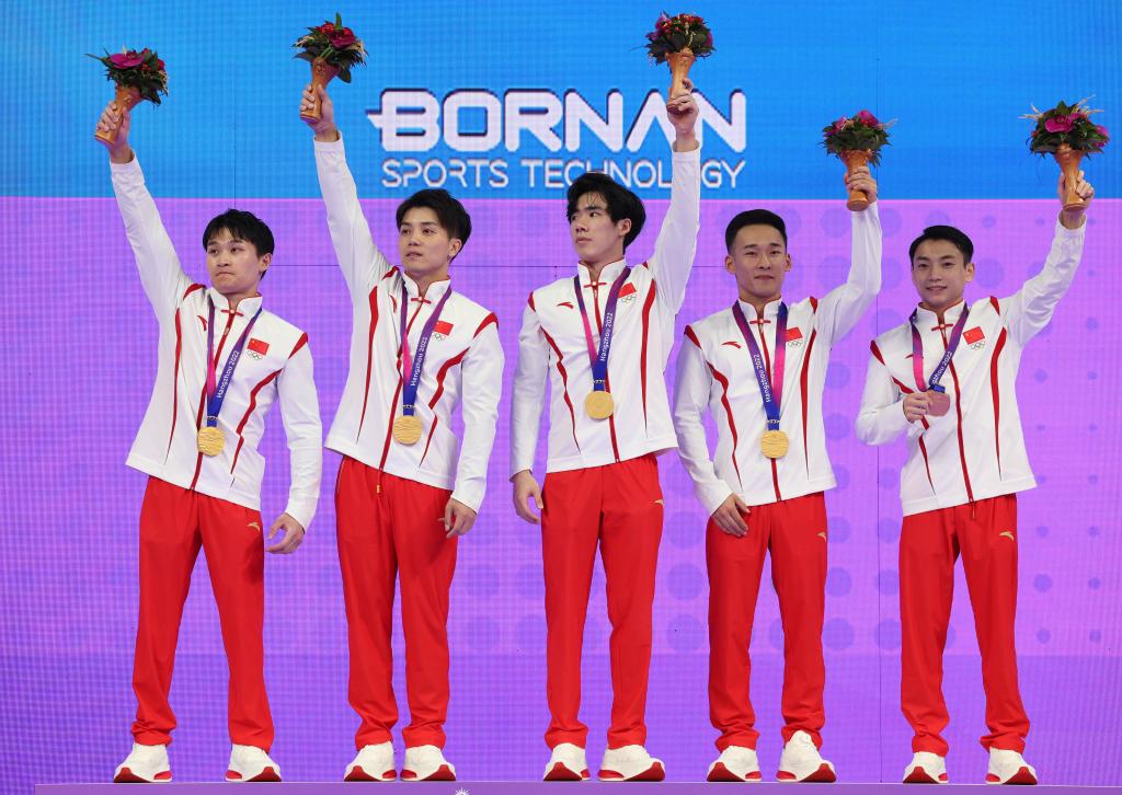 9月24日,冠军中国队选手兰星宇、林超攀、张博恒、肖若腾、邹敬园(从左至右)在颁奖仪式上。新华社记者 程婷婷 摄