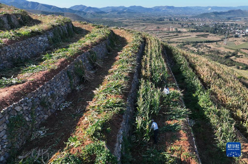 金秋时节,在河北省遵化市刘备寨乡由丘陵坡地改造成的梯田中,农民抢抓农时收获玉米等秋粮。近年来,遵化市大力实施土地整治工程,将浅山丘陵坡地和荒草地改造成保水保肥的水平梯田,促进农业增效、农民增收。