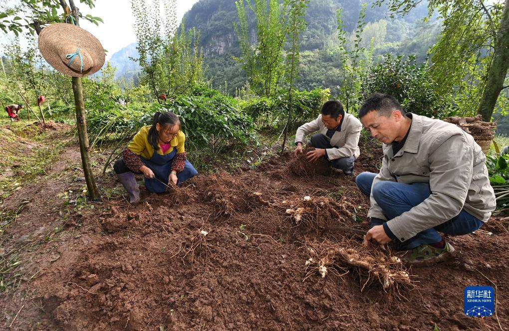 10月10日,在重庆市石柱土家族自治县中益乡华溪村,村民在种植园内收获黄精。