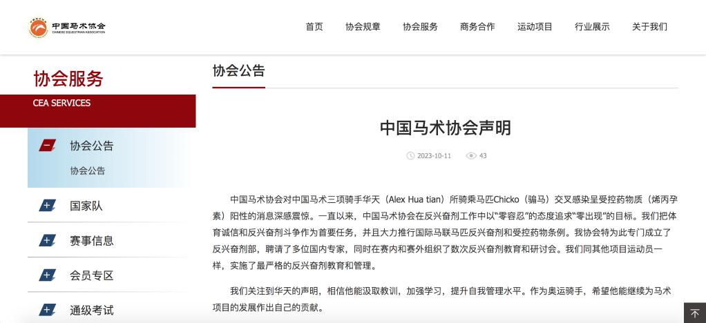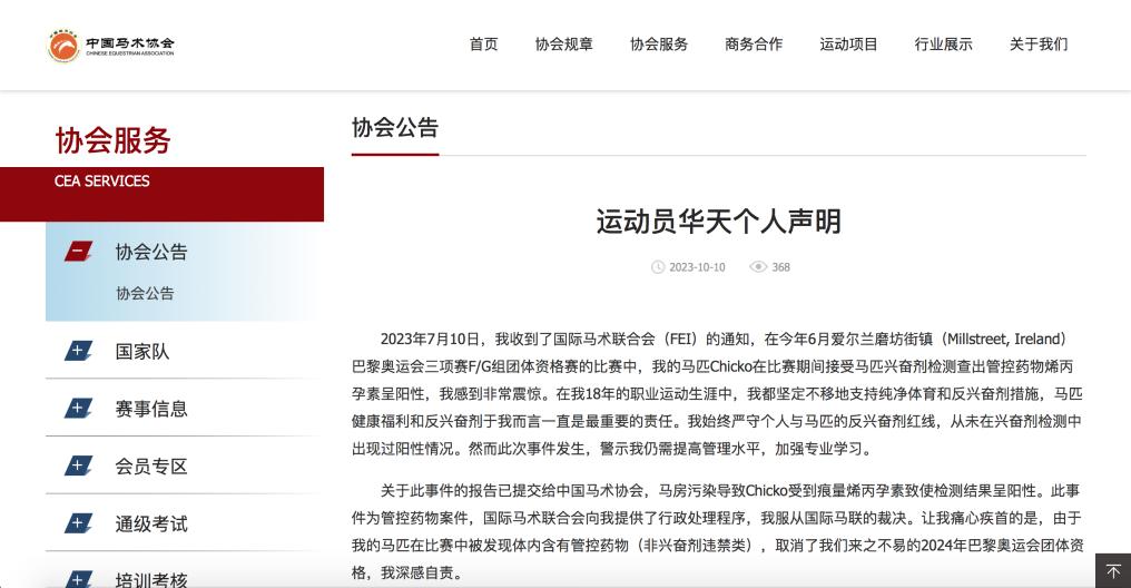 北京时间10月10日晚,国际马联宣布,因华天的马匹搭档、13岁的骟马Chicko的赛期检测呈管控药物烯丙孕素阳性,奥运资格赛时队内排名第一的华天和Chicko的成绩被取消,而原本不计入总分的另外一对人马组合成绩与之相去甚远,日本队遂以125.7罚分升至第二,并递补获得巴黎奥运会马术三项赛团体赛资格。