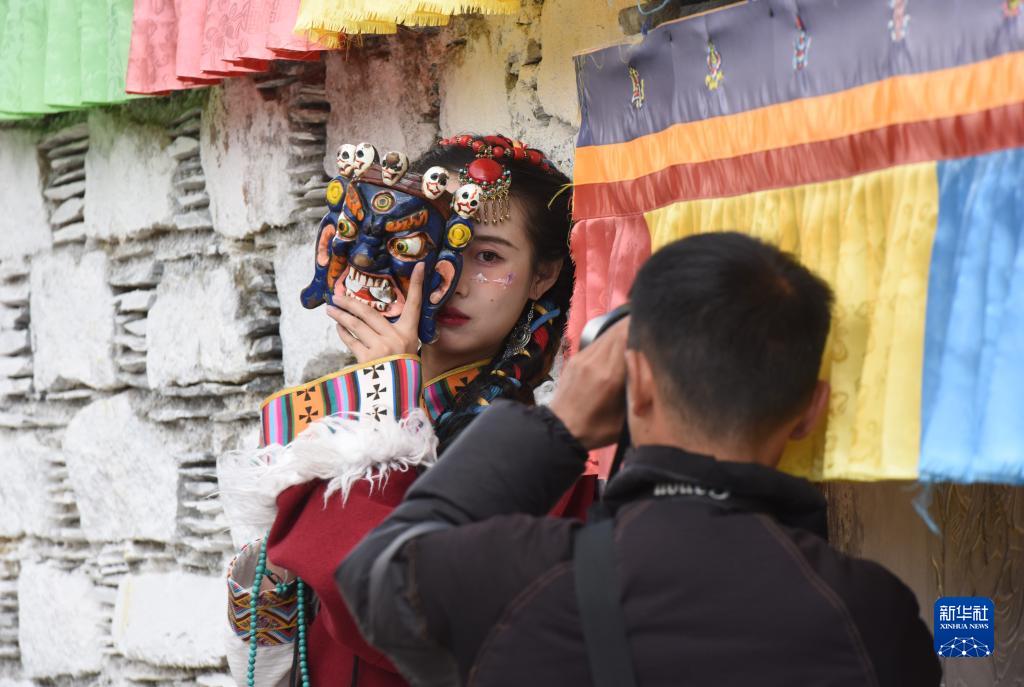 10月10日,在四川甘孜藏族自治州理塘县,游客在街头拍照。