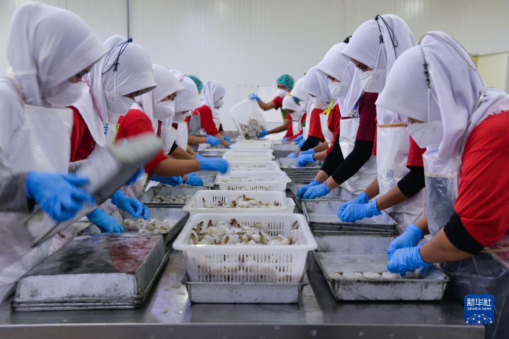 2023年8月29日,在印度尼西亚中爪哇省三宝垄市,工人在福建淼天汇食品有限公司印尼公司的对虾加工生产线上工作。