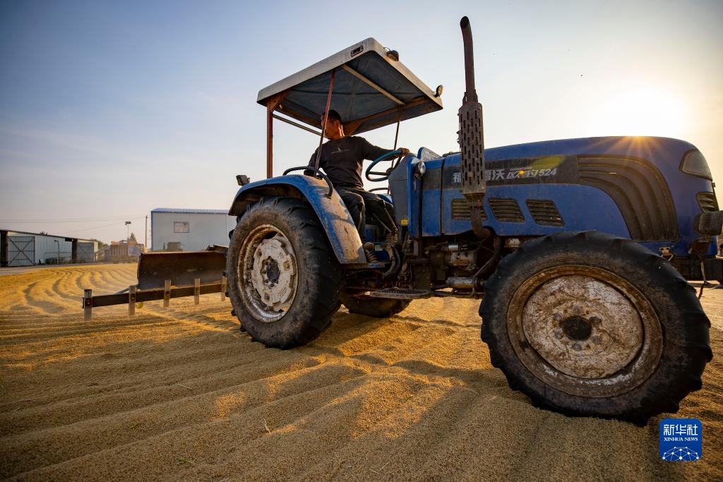 在宁夏银川市贺兰县立岗镇通义村,农民操作机械在晒场劳作(10月10日摄)。