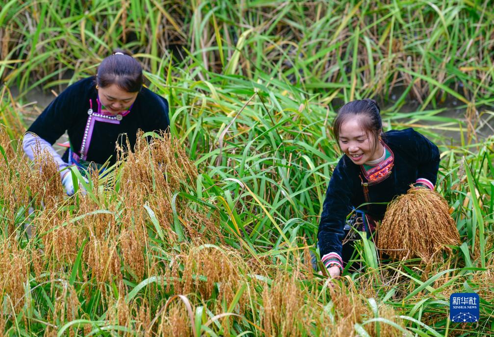 10月11日,村民在贵州省从江县高增乡建华村采收香禾糯稻谷。