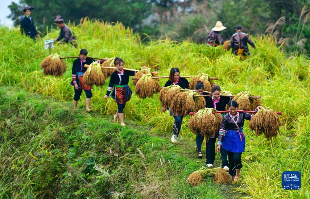 10月11日,村民在贵州省从江县高增乡建华村挑运香禾糯稻谷。