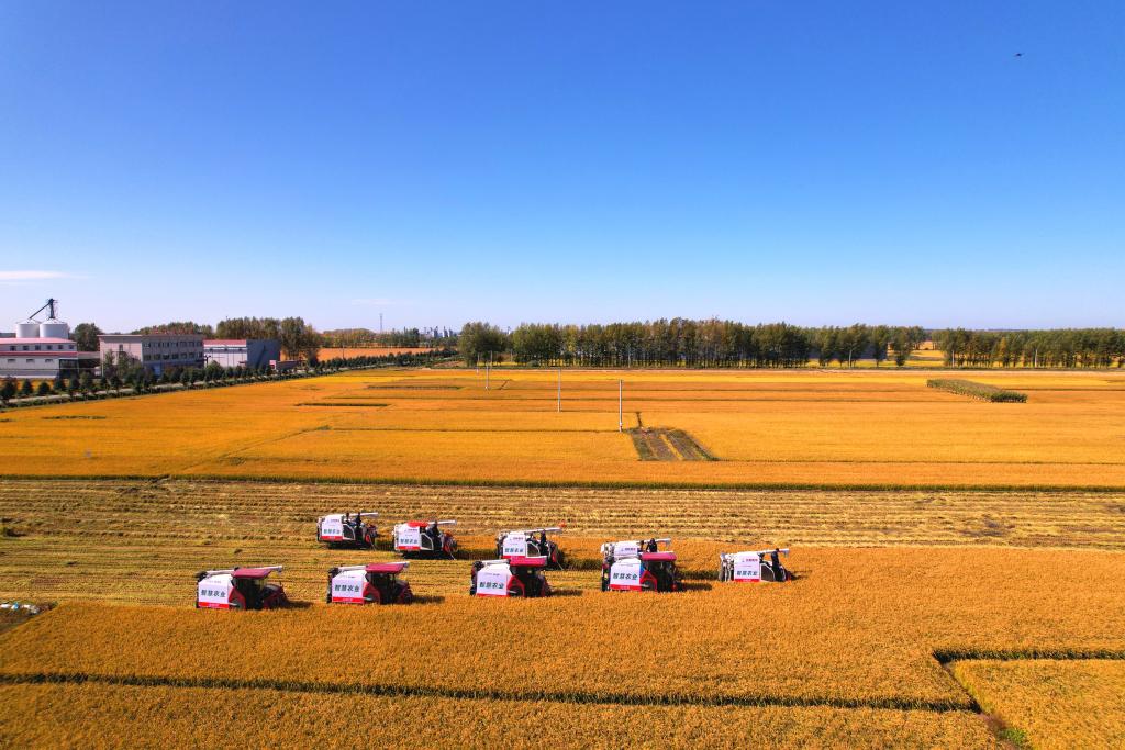 黑龙江省绥化市北林区的水稻科技示范田里正在进行收获作业。新华社发(蒋宝栋摄)