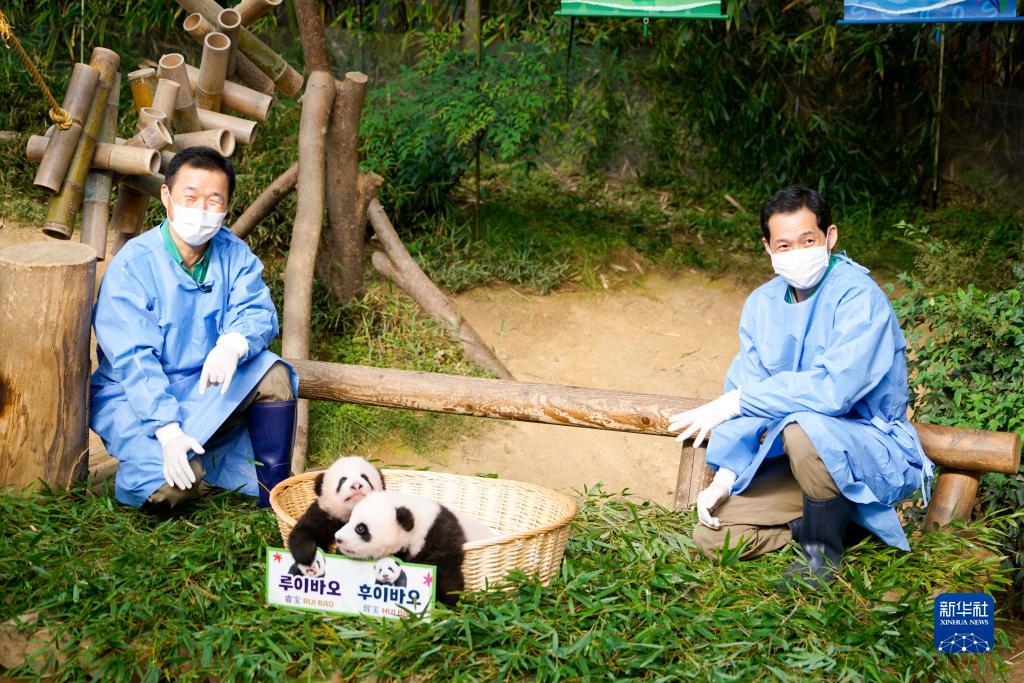 当日,旅韩大熊猫“爱宝”、“乐宝”的双胞胎幼崽首次与公众见面。双胞胎幼崽的名字“睿宝”、“辉宝”也同时公布。