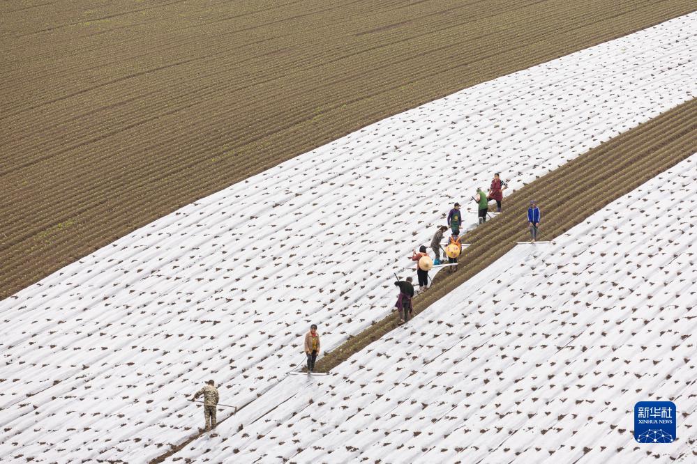 10月11日,在蓬安县锦屏镇中坝社区蔬菜种植基地,村民在田地里覆地膜。