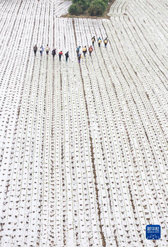 10月11日,在蓬安县锦屏镇中坝社区蔬菜种植基地,村民在田地里进行萝卜幼苗“破膜露苗”作业。