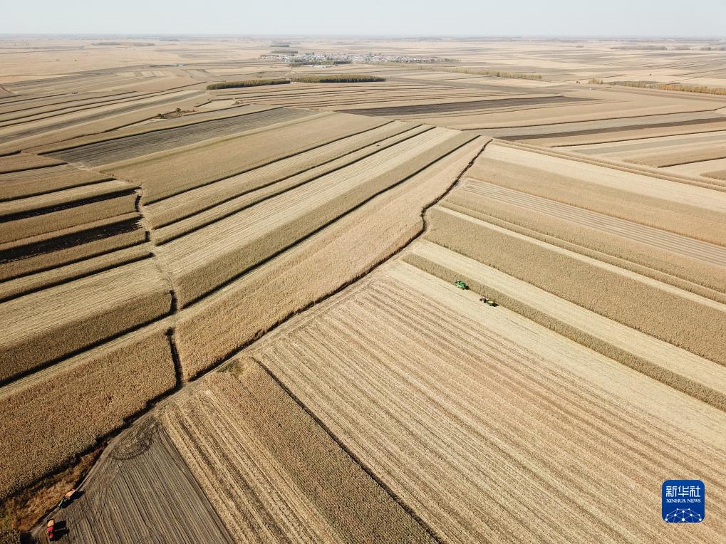 10月11日,收割机在黑龙江省富锦市一块玉米地收获玉米(无人机照片)。