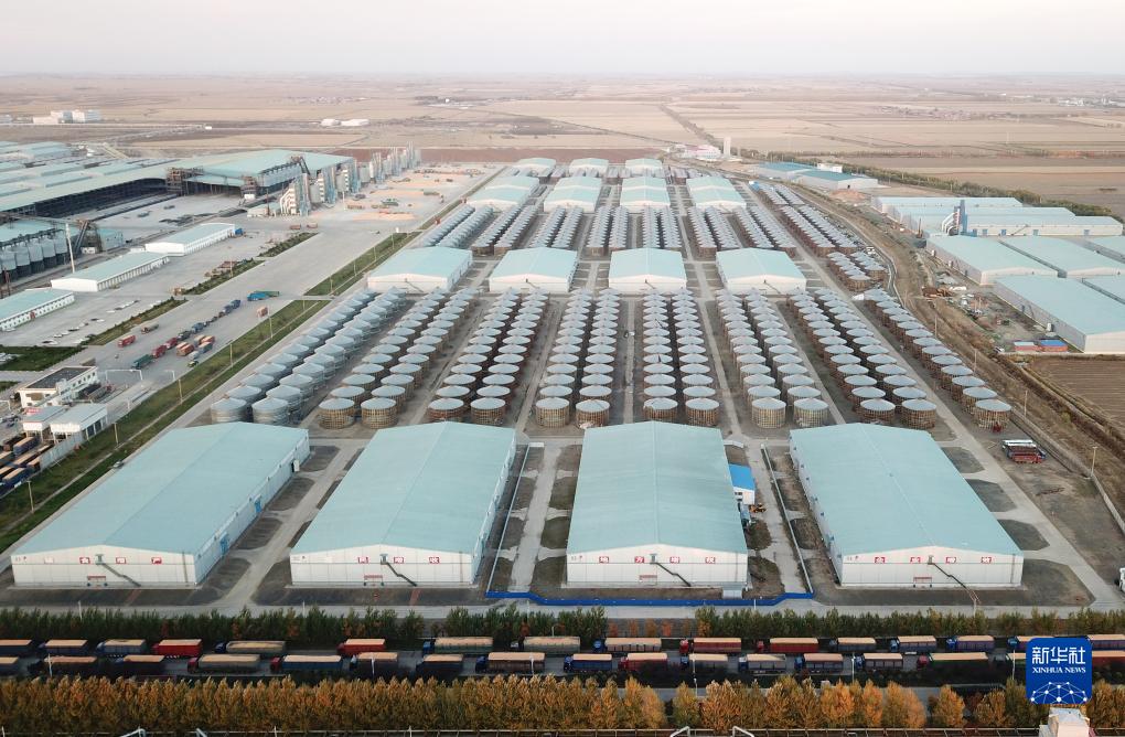 10月11日,送粮车在黑龙江省富锦市一大型粮食仓储加工企业外排起长队(无人机照片)。