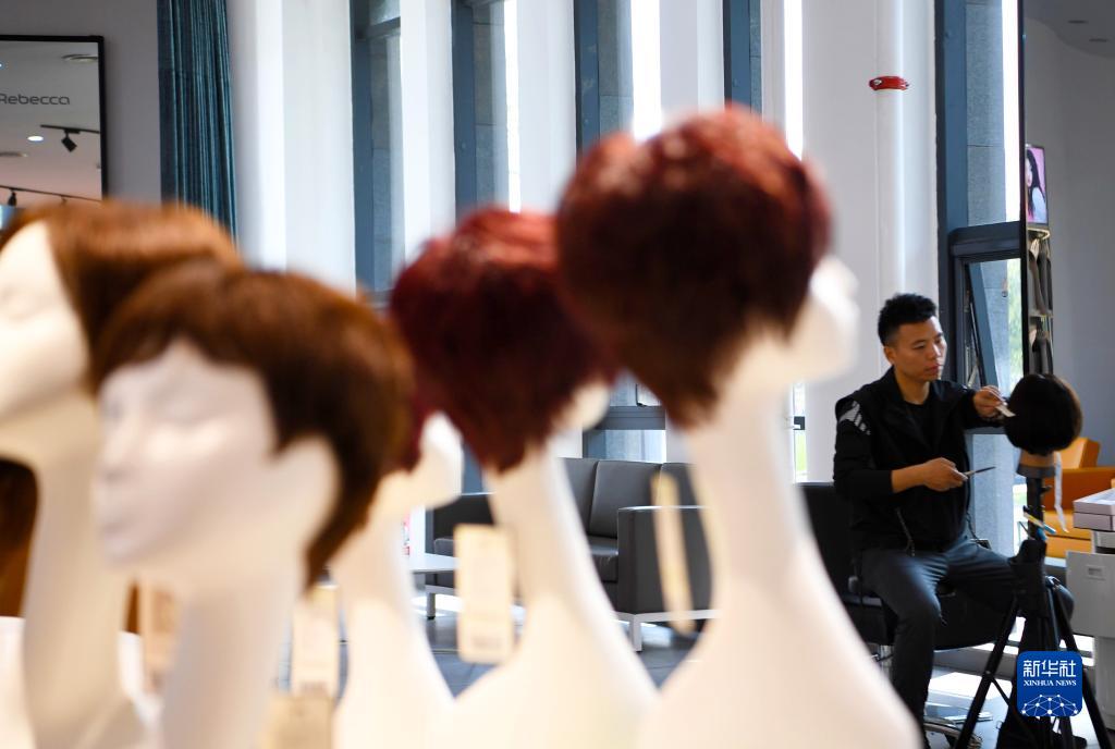10月11日,工作人员在河南瑞贝卡发制品股份有限公司的展厅内修剪假发。