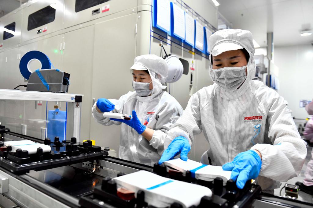 在位于枣庄的山东吉利欣旺达动力电池有限公司,工作人员在锂电池生产线忙碌。新华社记者郭绪雷 摄