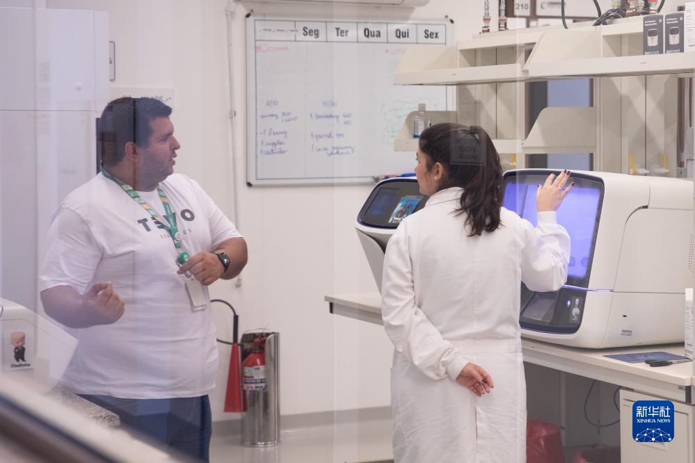 10月11日,在位于巴西圣保罗州克拉维纽斯的隆平巴西分子生物实验室,工作人员(右)为访客介绍育种器械。