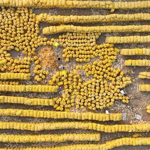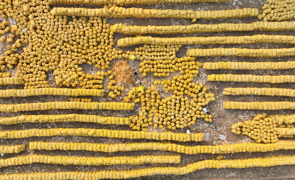 10月8日,农民在河北省隆尧县双碑乡亦城村一处玉米收储点内劳作(无人机照片)。新华社记者牟宇 摄