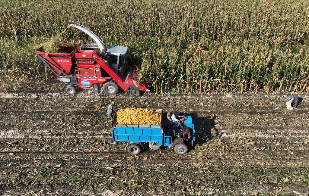 10月4日,河北省唐山市丰南区岔河镇的农民在使用机械设备收获玉米(无人机照片)。新华社记者杨世尧 摄