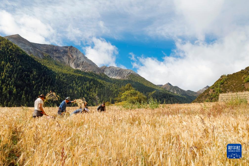 10月12日,在四川甘孜藏族自治州稻城县亚丁村,村民在收割青稞。