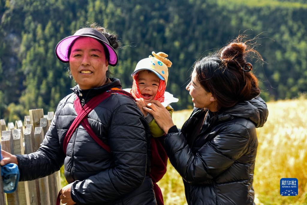 10月12日,在四川甘孜藏族自治州稻城县亚丁村,村民泽仁拉姆(右)收割完青稞与村民四朗卓玛(左)聊天。