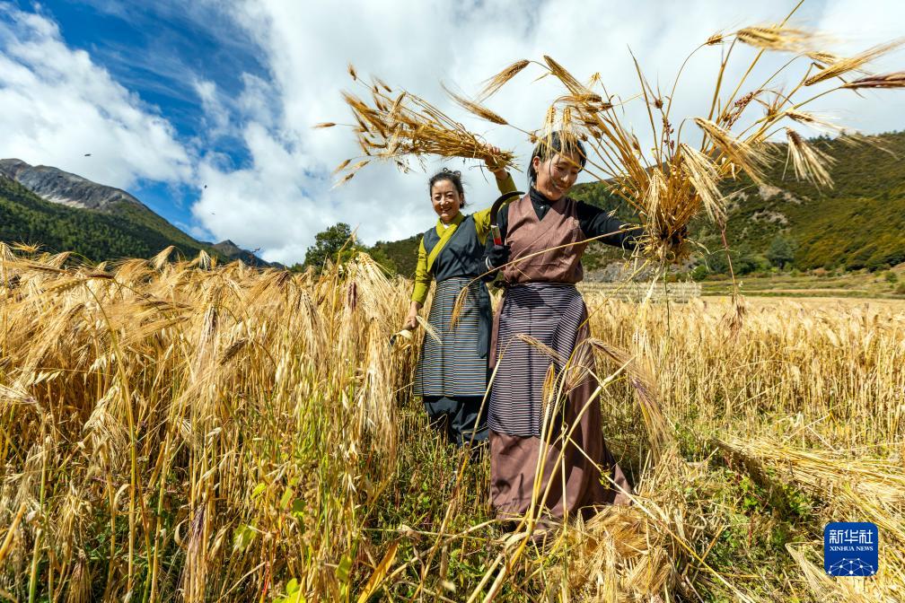 10月12日,在四川甘孜藏族自治州稻城县亚丁村,村民格拉姆(右)和小松呷在收割青稞。