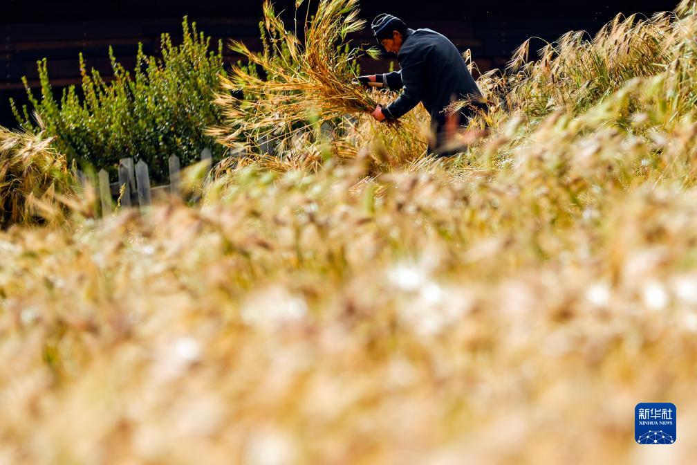 10月12日,在四川甘孜藏族自治州稻城县亚丁村,村民在收割青稞。