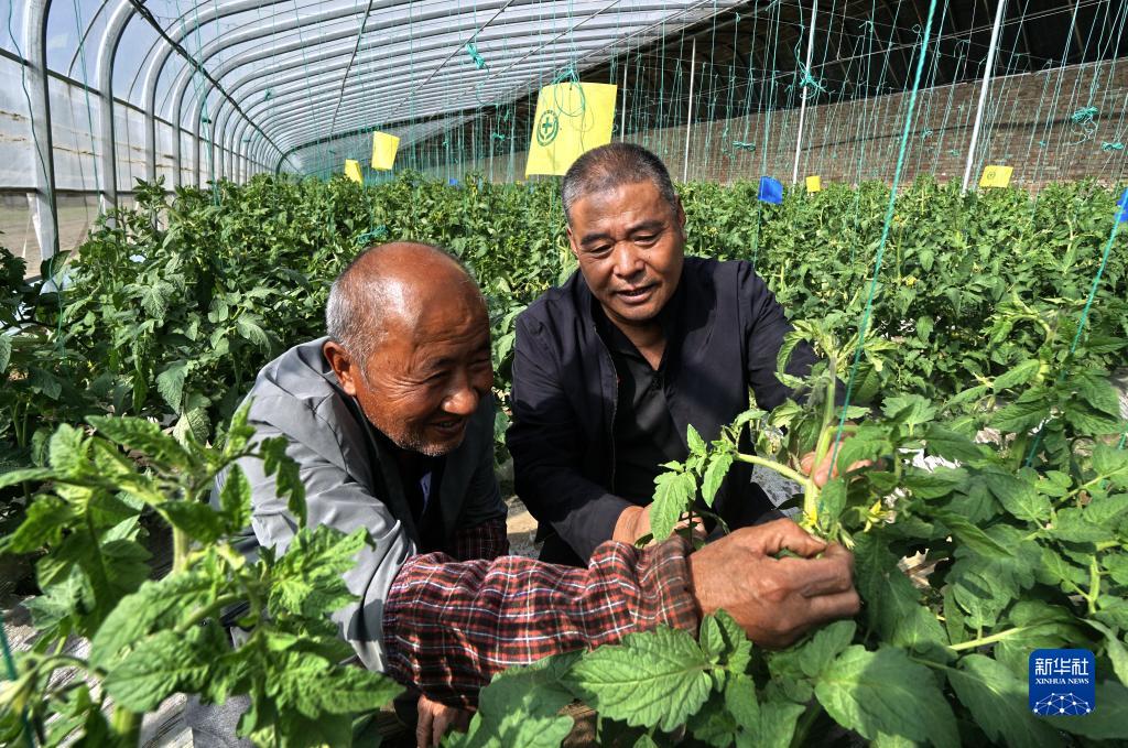 10月10日,大兴区长子营镇潞城营一村党支部书记连书山(右)和管护大棚的农民在观察大棚蔬菜长势。
