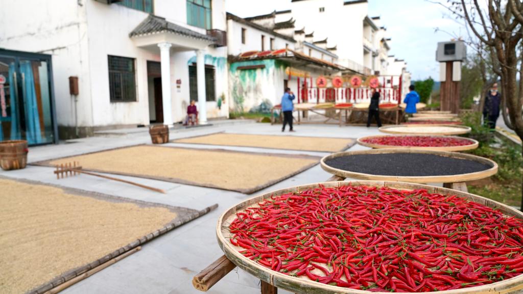 近日,江西省上饶市婺源县秋口镇王村的村民正在晾晒农作物。新华社记者 刘佳敏 摄