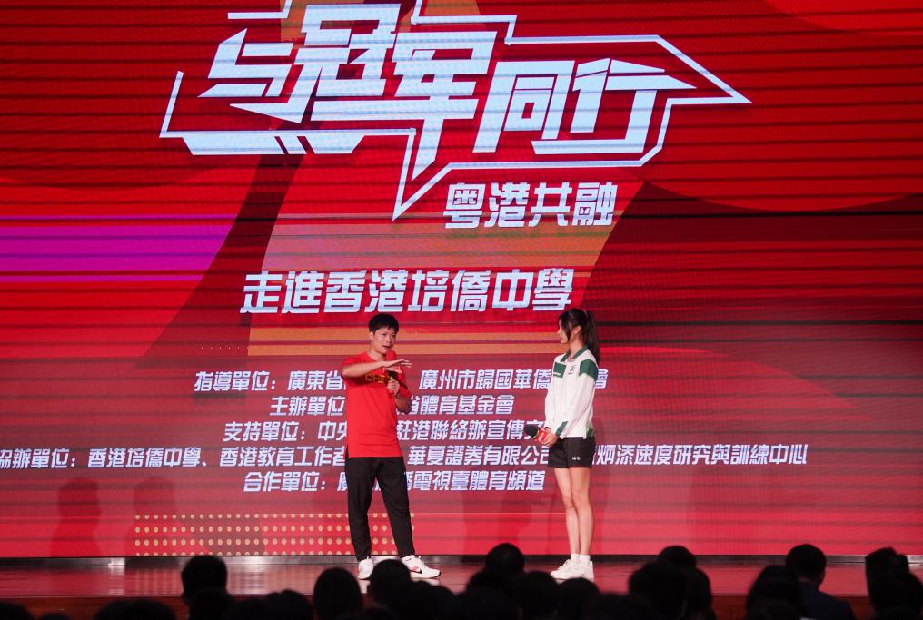 10月12日,在香港培侨中学,中国短跑名将苏炳添(左)回答学生的提问。新华社记者 王申 摄