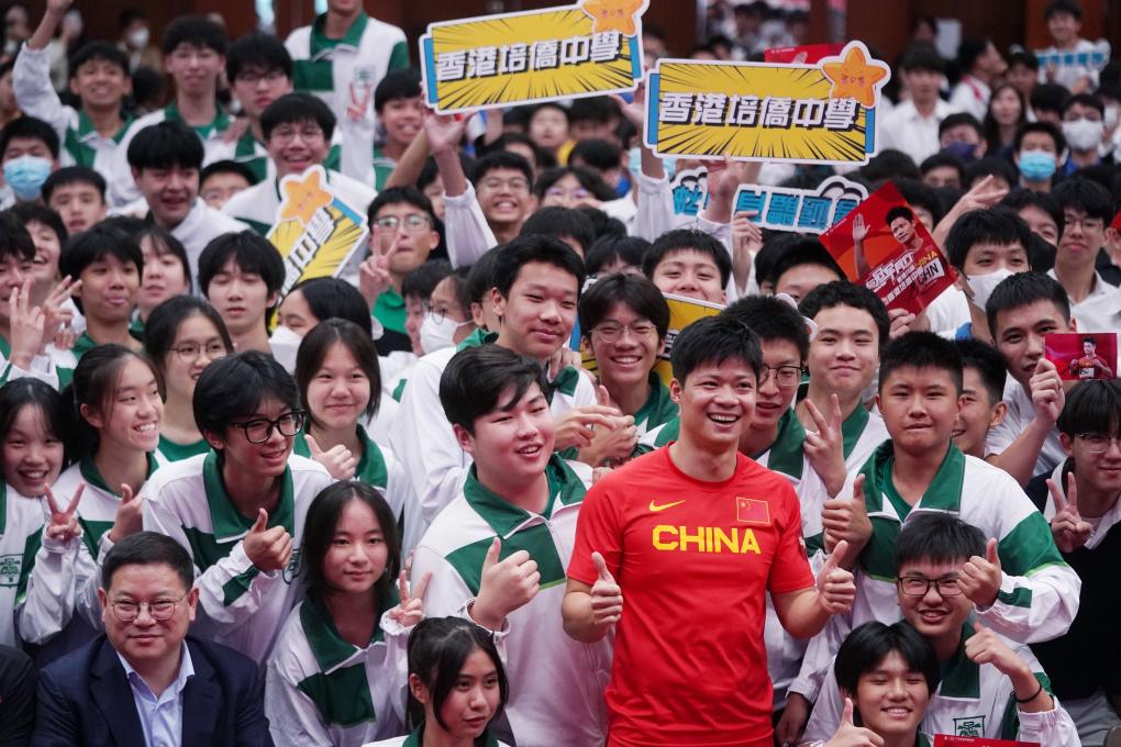 10月12日,在香港培侨中学,中国短跑名将苏炳添和师生、嘉宾合影。新华社记者 王申 摄