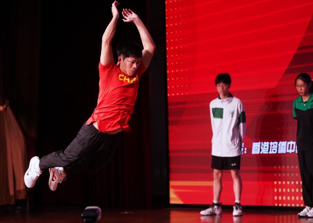 10月12日,在香港培侨中学,中国短跑名将苏炳添(左)示范立定跳远。新华社记者 王申 摄